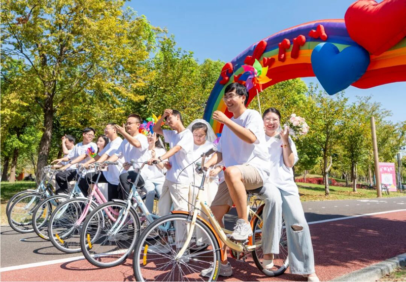 2025年8月29日是中国传统节日“七夕”,新人们在江苏省海安市民政局结婚登记上湖户外颁证基地参加集中颁证仪式,通过参与“为爱出发骑行”“特色游园会”等活动,倡导“喜事新办、婚事简办”新理念,引领文明节俭的婚嫁新风尚。